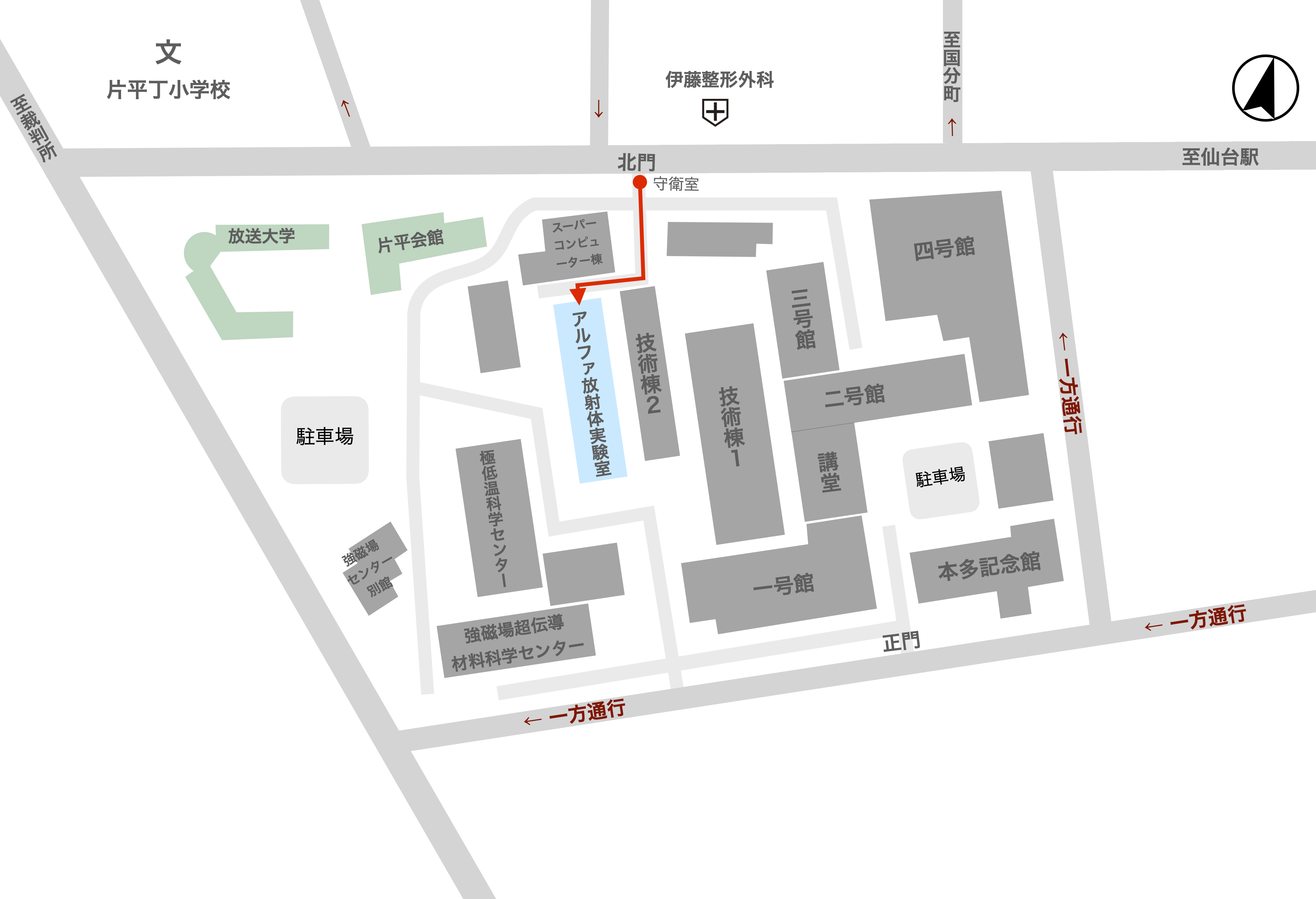 | 駐車場 | ゲートで臨時の入構許可をとっていただくことはできますが、台数制限が非常に厳しいので、公共交通機関のご利用をお勧めします。 |